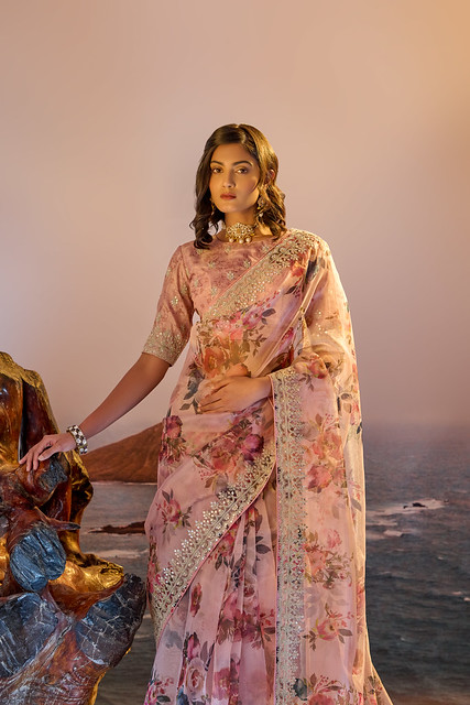 Elevate your style with Noor-E-Gul, a sheer organza saree adorned with artistic floral prints. Light as air and beautifully structured, it’s the perfect ensemble for summer soirées and garden parties. The play of pastel hues gives it an ethereal, graceful presence.